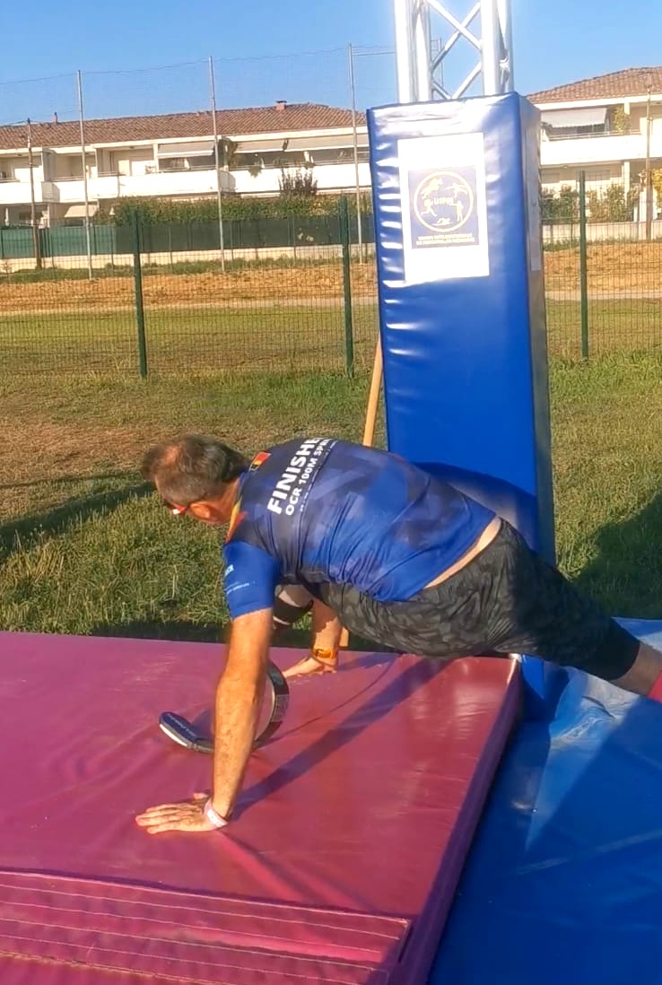 En toute fin d’entrainement, il décide d’enchainer un parcours complet pour se tester. Je l’attend au niveau des poutres au milieu du parcours, mais il disparait après avoir franchi l’obstacle de la Big Wheel, caché par le mur de 1,5m.
