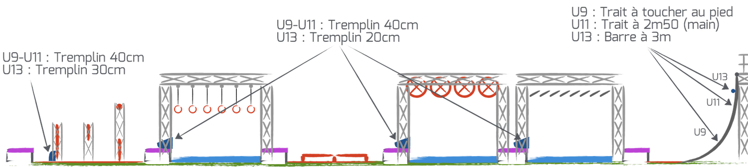 U11 : En cas de double échec, le concurrent marquera 0 points mais sera autorisé à poursuivre jusqu’au finish, sans recommencer les obstacles ratés suivants. Les U11 sont autorisés à s’aider des poteaux en début ou en fin d’obstacle. Finish : Touche la ligne tracée à la craie (2m60) avec la main ou une barre supérieure. Autorisés à poursuivre jusqu’en haut pour buzzer.