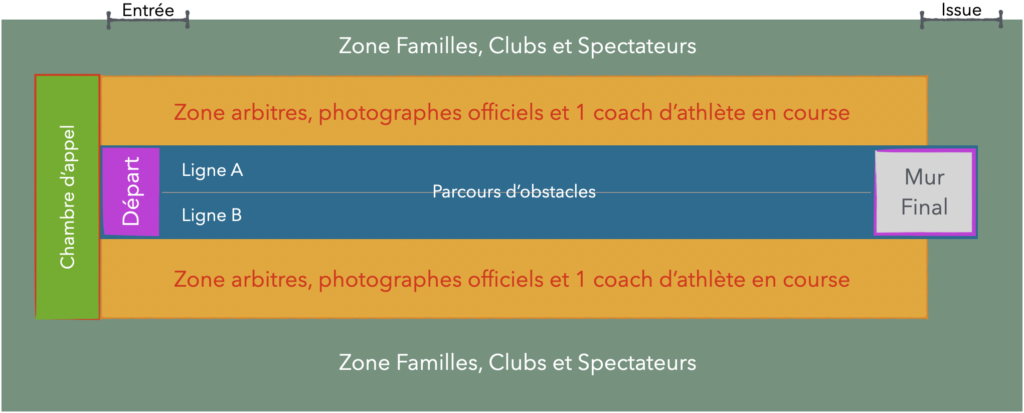 - Si un athlète traverse et court dans le couloir d’un autre athlète pour franchir les obstacles avec des éléments suspendus, il sera éliminé.